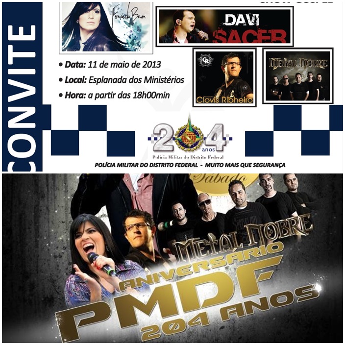 No dia 11 de maio (sábado), a partir das 18h, a Esplanada dos Ministérios receberá o Show Gospel em comemoração ao aniversário da PMDF. O evento, que é organizado pela Capelania Militar da Corporação e apoio da Secretaria de Cultura do GDF, contará com grandes nomes da música gospel nacional: Metal Nobre, Clóvis Ribheiro, Fernanda Brumm e Davi Sacer. Essa atividade coincide com a Semana Mundial de Oração, oportunidade para agradecer a Deus pela nossa Polícia Militar e interceder pela segurança pública de nossa cidade (entrada franca). Cap Gisleno-Cpl DF