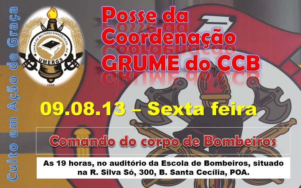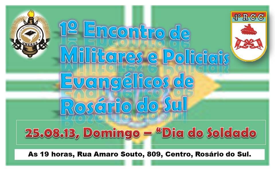 A UMERGS convida você a participar do 1º Encontro de Militares e Policiais Evangélicos de Rosário do Sul. O evento conta com o apoio do Tenente Coronel Kleber Torres Camerino, MD Cmt do 4º RCC e do Pastor Silomar Saller Pedroso, presidente da AD Rosário.