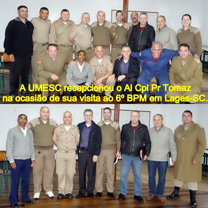 Neste dia 21 de junho o Cel Zinder Cmt da 2ª Região da PMSC, recebeu os Capelães Militares Evangélico, Pr Alex Thomaz de Almeida e Católico, Marcos Antonio Mota Moraes. Na oportunidade fez o uso da Palavra o Cel Zinder, Cmt da 2ª região, passando a oportunidade o Ten Cel Cpl Valdemar que distribuiu oportunidades aos mesmos para expor as atividades que estarão exercendo nos quartéis da PMSC e BMSC. A UMESC se fez presente na pessoa do Sgt Rotta vice-presidente, Sgt Antunes Secretario Executivo, Sgt Augusto Coordenador Regional, ST Medeiros e ST Pr Mauro que auxiliará na região de Lages, no louvores o Cb e Pr Iran. Foi entregue ao Cpl Thomaz um exemplar da Bíblia personalizada da UMESC.