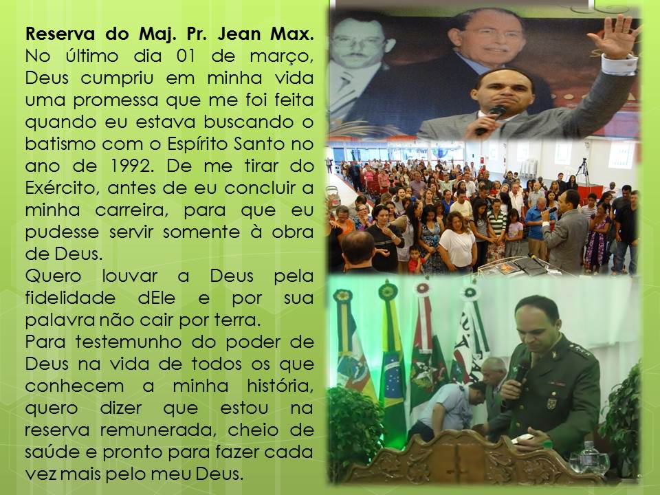 Dia 23 de fevereiro de 2013, no templo evangélico, no 2° BPM, foi realizado o 11° Aniversário do Templo Evangélico, o 2° ano do conjunto de senhoras (Cântico de Ana) , e 11° Aniversário do circulo de oração.