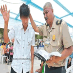 O policial se aproxima de um jovem ora por sua vida com imposição de mão. Ora por sua mudança na vida de um jovem com os olhos fechados(f0t0), como também para dezenas de pessoas que ouviram a pregação em Lima e nas províncias e por todos os jovens de vários países sul-americanos. A Maldade é universal, mas também a obra de Deus.